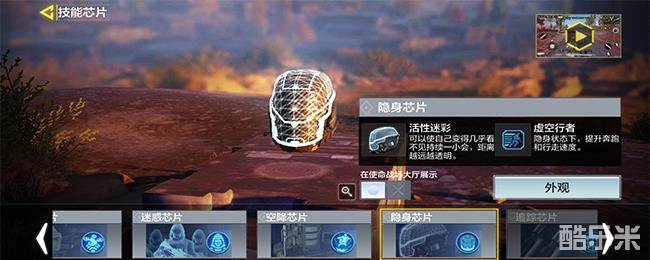 这个芯片有两种加成效果,第一种是活性迷彩,让自己在一段时间内可以隐形,离敌人越远角色越透明。第二个效果是虚空行者,隐身状态下能够增加跑步速度和行走速度。