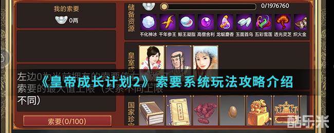 在皇帝成长计划2手游中索要系统怎么玩呢?索要系统就是可以从别人要东西,银两宝物都可以,那么想知道索要系统玩法的就跟随小编一起来看看吧。