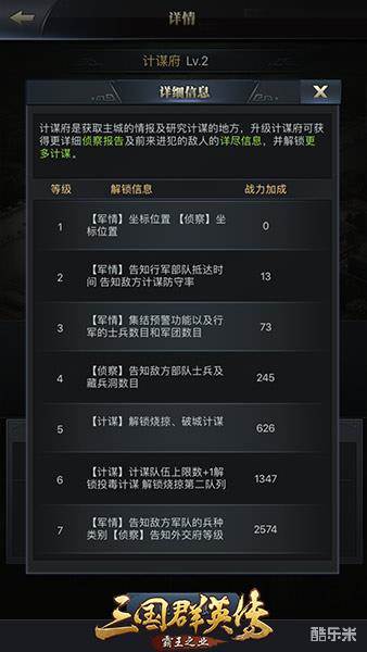 玩家想要研究《三国群英传-霸王之业》手游的“计谋”,需要从“计谋府”建筑的智囊团中进入。计谋划分为烧掠、破城、投毒、散谣、诱兵,共五个类别,满足不同情况下的攻城拔寨所需。此外,还有“侦察”这一谍报行动。