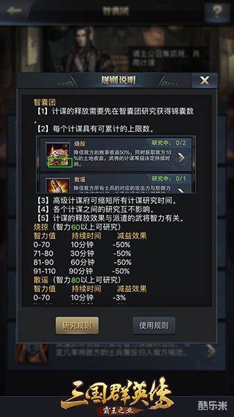 想要研发《三国群英传-霸王之业》手游中的计谋,玩家需要派遣智力高的武将进行研究。因为武将的智力直接决定这计谋的研究结果,武将智力越高,计谋研究得越快,计谋等级也会越高。值得注意的是,游戏中的五名武将拥有“计谋加成”这一特殊技能,能大大增强相应计谋的效果。