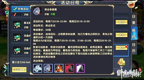 帮会争霸赛活动是《卧虎藏龙贰》中一个全新开放的玩法,是一场为双方帮派之间对抗的群体PK活动。帮会争霸赛在每周周六晚上20点10分开放,设置了甲、乙、丙、丁、戊、己、庚、辛、壬、癸10个联赛级别,每个联赛级别最多有8个帮会参战;帮主和副帮主可选拔本帮内的优秀之士与其他帮派进行对决。在比赛中占领更多的战旗,给己方增加占领积分,率先达到满积分的一方获胜。参与角逐之后获得胜利的帮会除了可获得丰富的银币、帮贡等奖励之外,更可获得专属稀有坐骑皮肤。