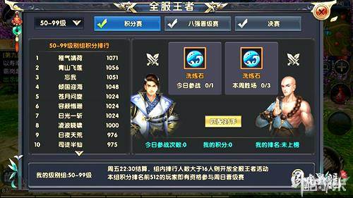 全服王者积分赛每周一至五开启,开启时间内可以进行实时跨服匹配,参与全服王者积分赛的玩家会获得一个初始的分段,点击活动面板中的匹配按钮即可进行1V1的匹配,匹配成功后在规定时间内战胜对手即可获得积分,每次击败对手后自己的基础分就会上升,相应的排位也会上升。每周统计一次积分,积分排名前列的玩家将有资格进入晋级赛。