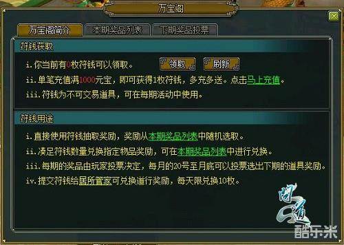 并且,每个月20号至月末,在当月充值超过1000元宝的玩家可以对下一期的可兑换奖励进行投票,来决定下一期中万宝阁中的道具类型。各区组投票结果独立计算,互不影响。投票结束后,每个分类下得票数前3名的道具确定为下期奖品,如有不足三种道具的情况,系统将随机决定补足三种道具。