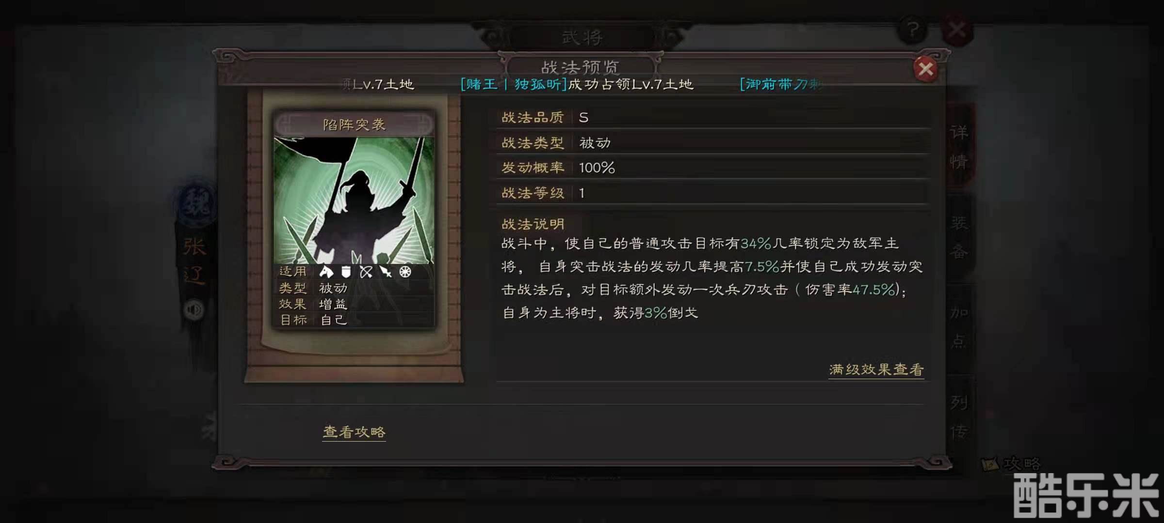 张辽的面板属性是武力值92点,统率值95点,是一个典型的攻守兼备型输出武将,自带的战法是陷阵突袭,效果是在进行普通攻击的时候,有一定的几率直接锁定敌方的主将,如果装备了突击战法的话,战法的发动概率提高15%,如果成功发动了战法,则额外在附加一次兵刃伤害。张辽的最大特点就是可以锁定主将,获得斩首的效果,加成魏骑流本来就是走爆发输出路线,更是助力张辽大展神威。