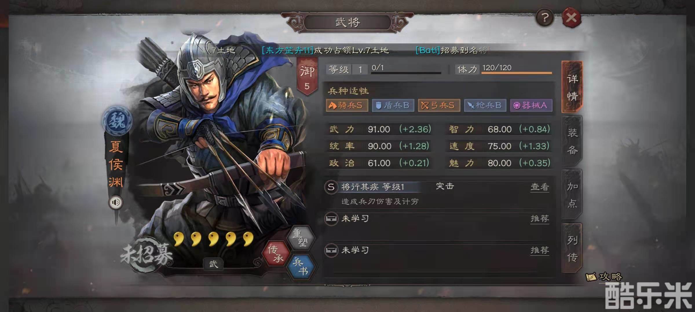 夏侯渊的面板属性是武力值91点,统御值90点,虽说比张辽低一些,但是也属于一流武将行列,自带的战法是将行其疾,效果是在进行普攻之后,可以随机选择一名敌方武将发动一次攻击,如果选择了敌方的主将的话, 还可以额外造成技穷效果,被技穷的目标无法无法使用主动技能。夏侯渊对于主将的伤害也是很大的,这一点和张辽和相互配合。