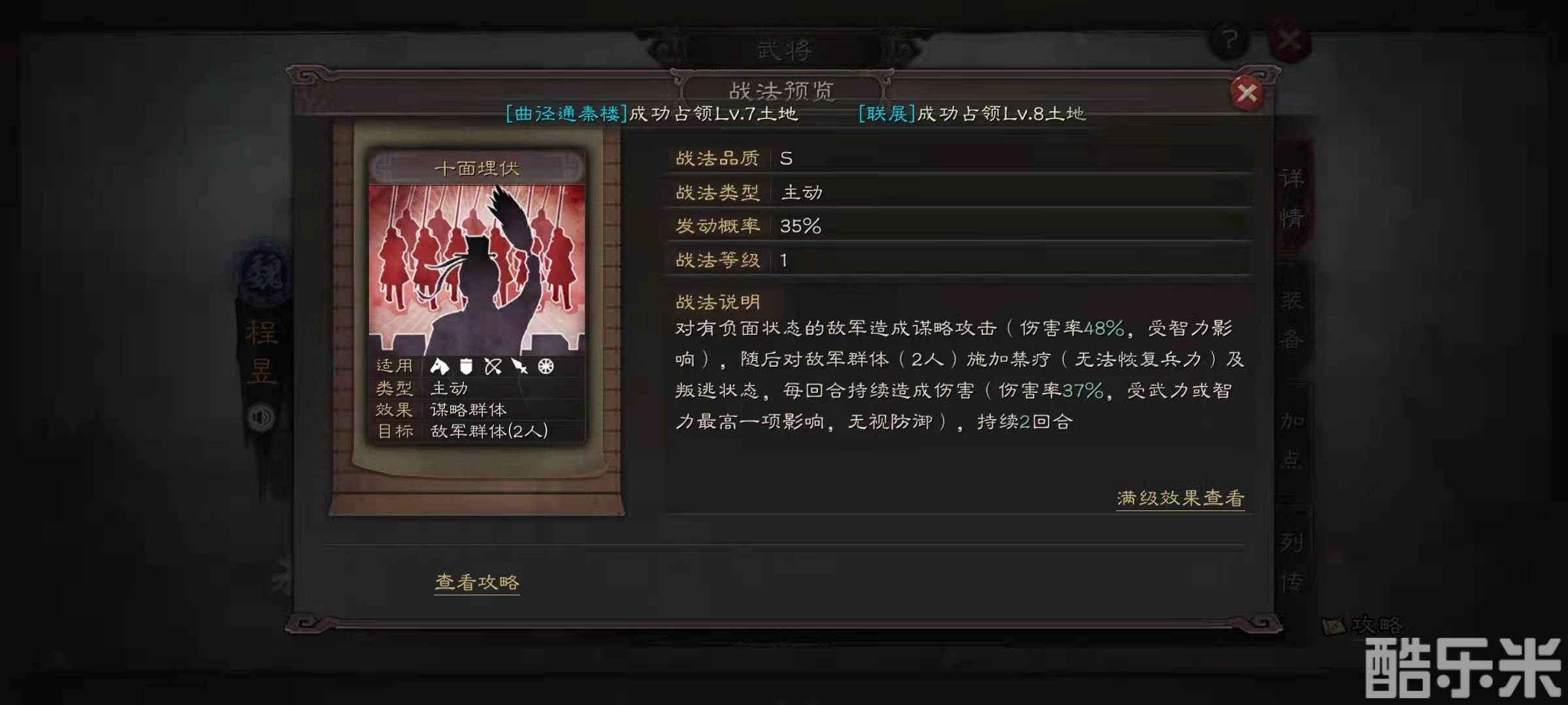 程昱的面板属性是智力90点,算是比较高的谋略型武将了,自带战法十面埋伏,效果是可以对有负面状态的敌军造成伤害,并且附加禁疗效果和溃逃状态,禁疗是无法恢复兵力,溃逃是持续掉血。为了配合程昱,张辽和夏侯渊都需要搭配一些具有负面状态的技能,这样一套魏骑流阵容就搭配好了。