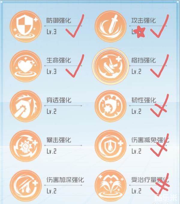 攻击强化lv.3 → 防御/生命/格挡强化lv.3 → 攻击强化lv.5 → 防御/生命/格挡强化lv.5 → 韧性/伤害减免强化lv.5 (→ 受治疗量强化lv.5)