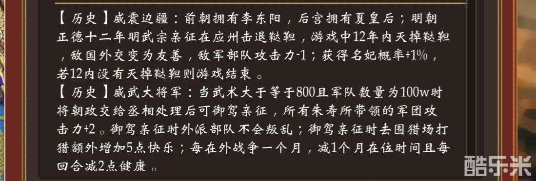 Buff:刘邦历史觉醒后组建,攻击加2血量加1 刘彻根据城市数加buff,皇威1000攻击加1,对游牧文化伤害加20%,卫青霍去病组建军团攻击力血量加1