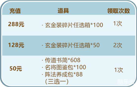 少年们单笔充值指定金额,即可得到玄金装碎片任选箱等珍稀资源,少年们千万不要错过哟~