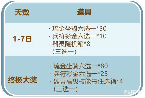 1-7日可领取:「琉金坐骑六选一」*30 或 「兵符彩金六选一」*10 或「器灵随机箱」*8