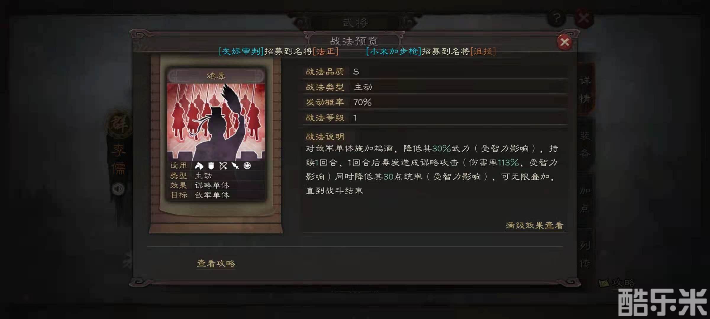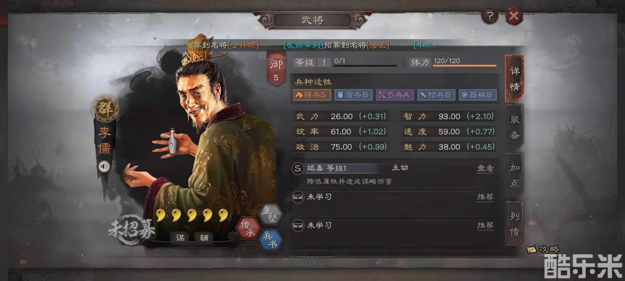 李儒的面板属性是智力输出为93点,统率值是61点,智力很高统率值比较低一些,兵种属性是骑兵为S,弓兵是A,盾兵和枪兵都是B。李儒的自带战法是鸩毒,效果是为敌方的单体武将喝下鸩酒,降低伤害目标最多60%的武力值,持续一个回合之后,毒酒发作造成谋略伤害,降低伤害目标最多60点统率值。战法效果可以无限叠加,一直持续到战斗结束。