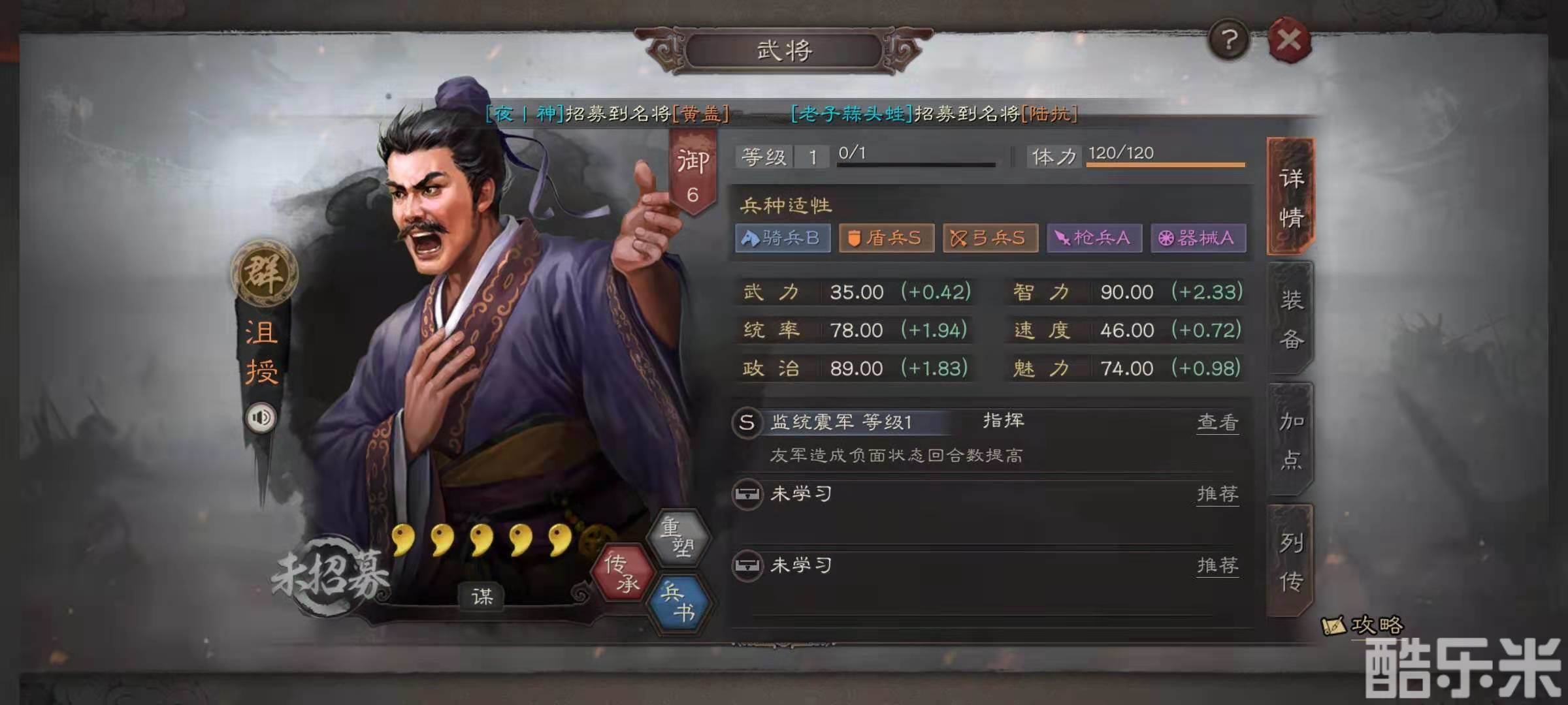 沮授的面板属性智力初始为90点,统率值初始为78点,兵种属性是盾兵和弓兵都是S,枪兵是A,骑兵是B。自带的战法是监统震军,效果是在战斗中,己方武将造成的负面状态,有一定的几率将持续时间延长一个回合。自身进行普攻的时候,选择身上负面状态最多的一名敌方武将造成额外的谋略伤害,如果敌方全体都没有负面状态,则效果变为给己方兵力最少的武将恢复兵力。