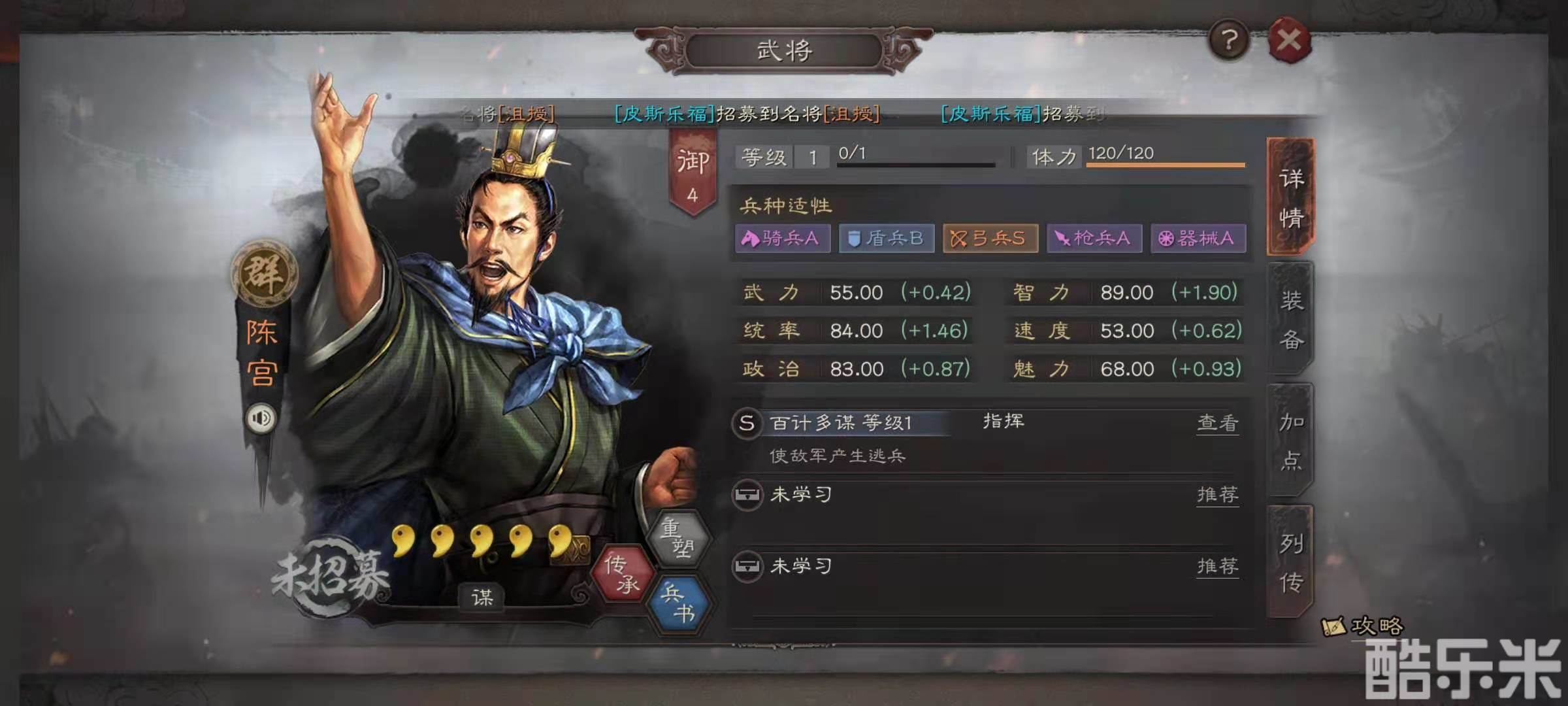 群雄阵容的黑科技搭配是和一般的群雄弓群雄骑等玩法不同,小编选择的是李儒,陈宫和沮授组成的负面状态黑科技阵容。其中陈宫的面板属性是智力初始为89点,统率值初始为84点,这个属性在谋略武将中算是很不错的了伤害,防御都有保证。陈宫的兵种属性是骑兵,枪兵都是A,弓兵是S。陈宫的自带战法是百计多谋,效果是每个回合,都有几率使得随机一名敌方武将产生逃兵效果,持续降低血量,逃兵伤害无视防御和减伤。