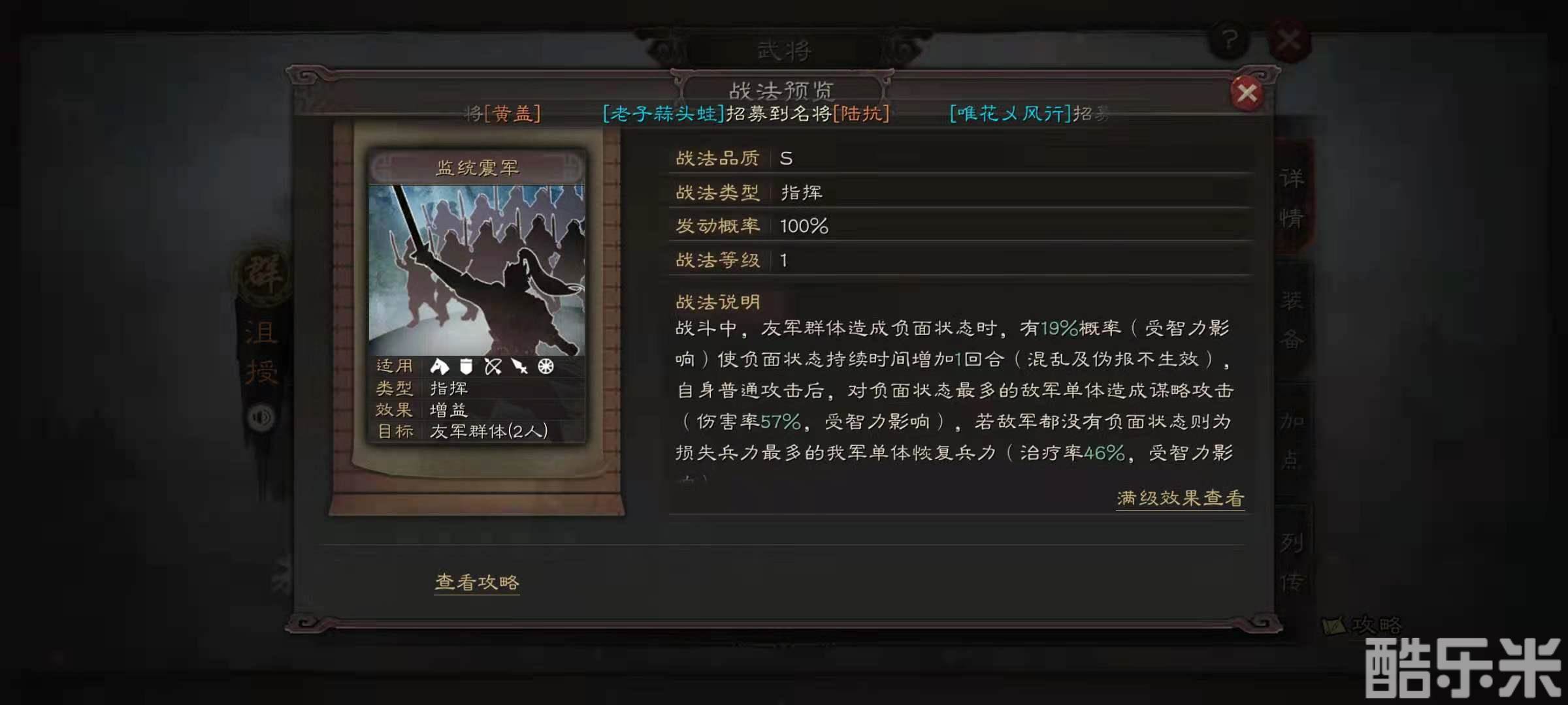 这一套阵容选择弓兵为主要兵种,核心就是各种负面状态,除了自带战法,每个武将都会在搭配上至少一本持续伤害或是异常状态的战法,例如妖术,风声鹤唳,刮骨疗毒等等,这样在沮授的技能加强下,能获得非常不错的效果。