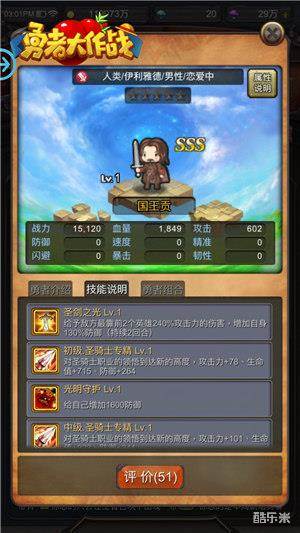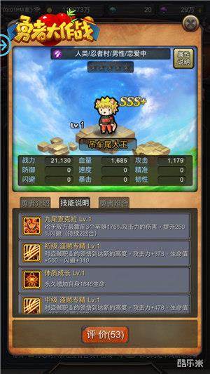 吊车尾大王:SSS+金色盗贼,能给予敌方最前3个英雄224%攻击力的伤害,提升260%闪避。吊车尾大王高攻击、高闪避,又有存活又有输出,建议将其安排在后排,克制专打后排的勇者。