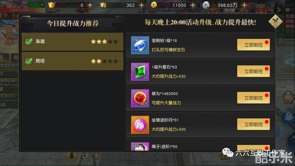 在主界面中,点击右下角的“变强”小拳头标志就可以打开战力提升的指引界面,在里面可以轻松选择各种提升战力的方式。