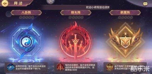 首先我们要明确三个阵法的效果,八卦阵增加【前两回合我方武将受到伤害降低】,锋矢阵增加效果【每回合结束后提高我方武将造成伤害结果】,鹤翼阵增加效果【我方武将被击退时回复其他武将最大生命值】。