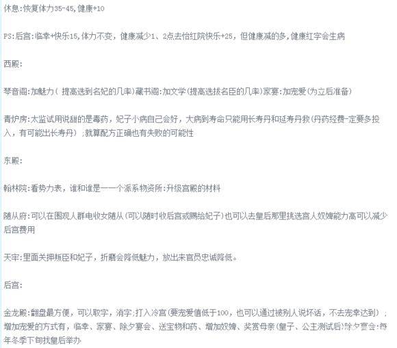 体力:上朝,学习,围猎等活动所需,过低折寿。睡觉,妃子(宫女)送餐增加,酒林肉池+10