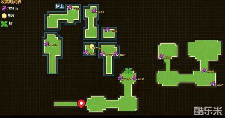 这个关卡的地图也比较小,基本上玩家按照地图走一遍就可以将道具、紫币、黄碎片全部收集齐全了,地图中一共有25个紫币,1个黄碎片,位置都比较好找,很容易就能看到,只有2个紫币比较难找到,那就是在树上的两个,具体的位置可以参考下面的地图,都在地图上面标识出来了。