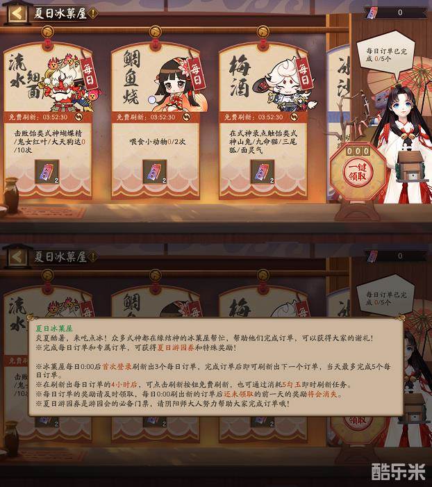 炎夏酷暑,来吃点冰!众多式神都在缘结神的冰菓屋帮忙,帮助他们完成订单,可以获得大家的谢礼!
