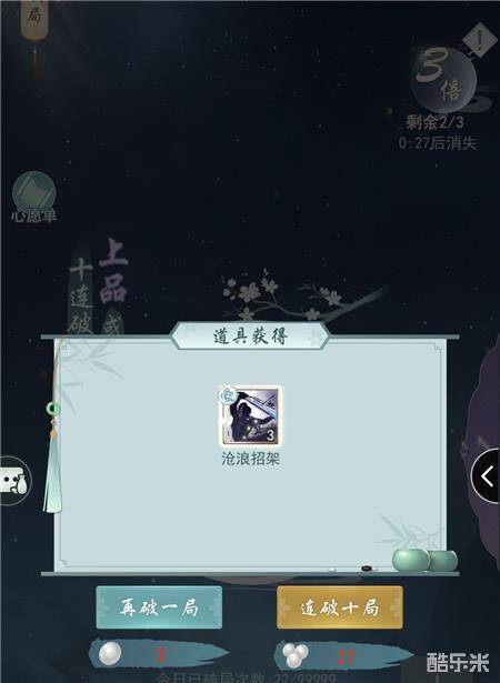三倍消耗的按钮,可以看到还有三次的次数限制,还有时间(30min)!这个机制利用好可以十二次大概率紫色*3(同一武学)