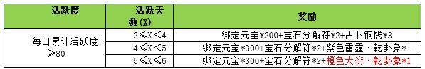 活动期间内,角色等级≥60级的玩家,每日活跃度累计值≥80,且活跃天数满足以下要求,将获得对应奖励。