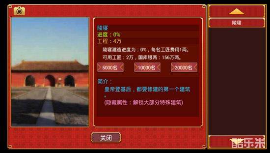 对于工部来说,在这里可以调集民工兵力来对皇宫进行建设,比如最开始要修建陵寝,这是新皇帝登基之后必须要修建的第一个建筑,募集的工匠越多,建成速度也就越快,但投入的成本也会相应的增加。在建成陵寝之后,就会解锁更多的建筑了,包括匠人所、各类书院、国子监、寒士舍、夫子庙、皮革坊、铁匠铺、骑兵营、神机所、地方校场、演武场、作战医护、点将台等,根据当前的需求可以选择性的建造,建议优先建造有利于获取高质量臣子的建筑。