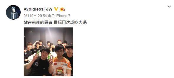 昨天下午在台湾电竞馆,龙珠战队和周杰伦名下的JT战队进行了一场别趣横生的水友赛。活动结束后SNG战队的打野阿伟带着龙珠的队员们去火锅店大吃了一顿,并发微博称“站在前线的勇者 目标已达成吃火锅”。