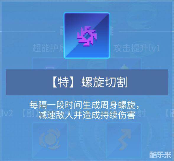 每隔一段时间生成周身螺旋,减速敌人并造成持续伤害。除了造成伤害外,螺旋切割还是个很好用的护身技能。在螺旋切割展开期间,即使BOSS的弹幕击中我们,也可以通过螺旋切割抵御在外。BOSS战的不二之选,有螺旋切割必拿。