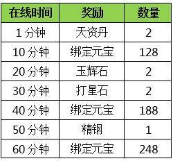 活动期间内,登录游戏,保持一定在线时长,即可领取绑定元宝等奖励。