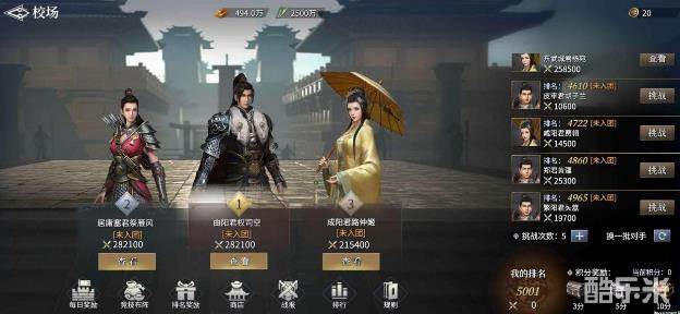 校场这个玩法的意思就是玩家们可以在比赛中相互挑战来争夺名次,最后会根据每个玩家名次的高低来分配奖励,名次越高的奖励就越丰富。1.玩家们一天之内可以挑战5次,每次挑战都会消耗掉校武牌,一天有5张,一定要打有准备之仗,毕竟机会难得。