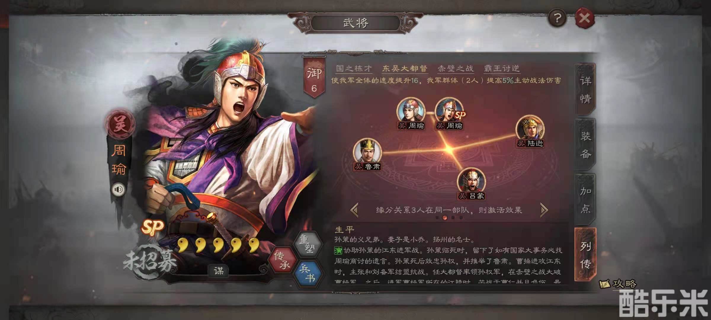 目前在三国志战略版中,登场的吴国大都督们有周瑜,鲁肃,陆逊,吕蒙和SP周瑜等五名武将,这些武将如果能同时上阵任意三名武将的话,就可以激活东吴大都督的缘分属性。属性增加的是全体上阵武将的速度,还有就是我方两名武将造成的主动战法伤害提升,所以东吴大都督玩法是非常有必要的,速度增加了就意味着比对手要先出手,在很多时候先出手就意味着胜利。