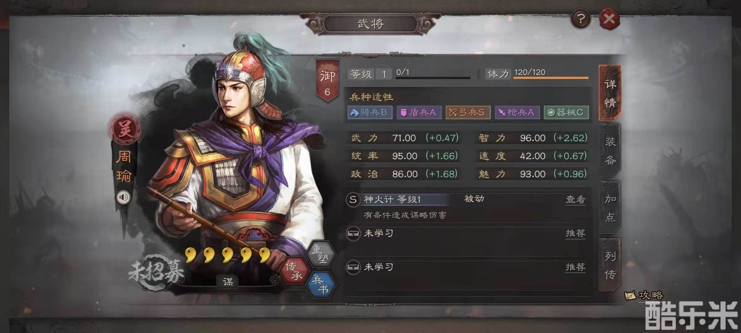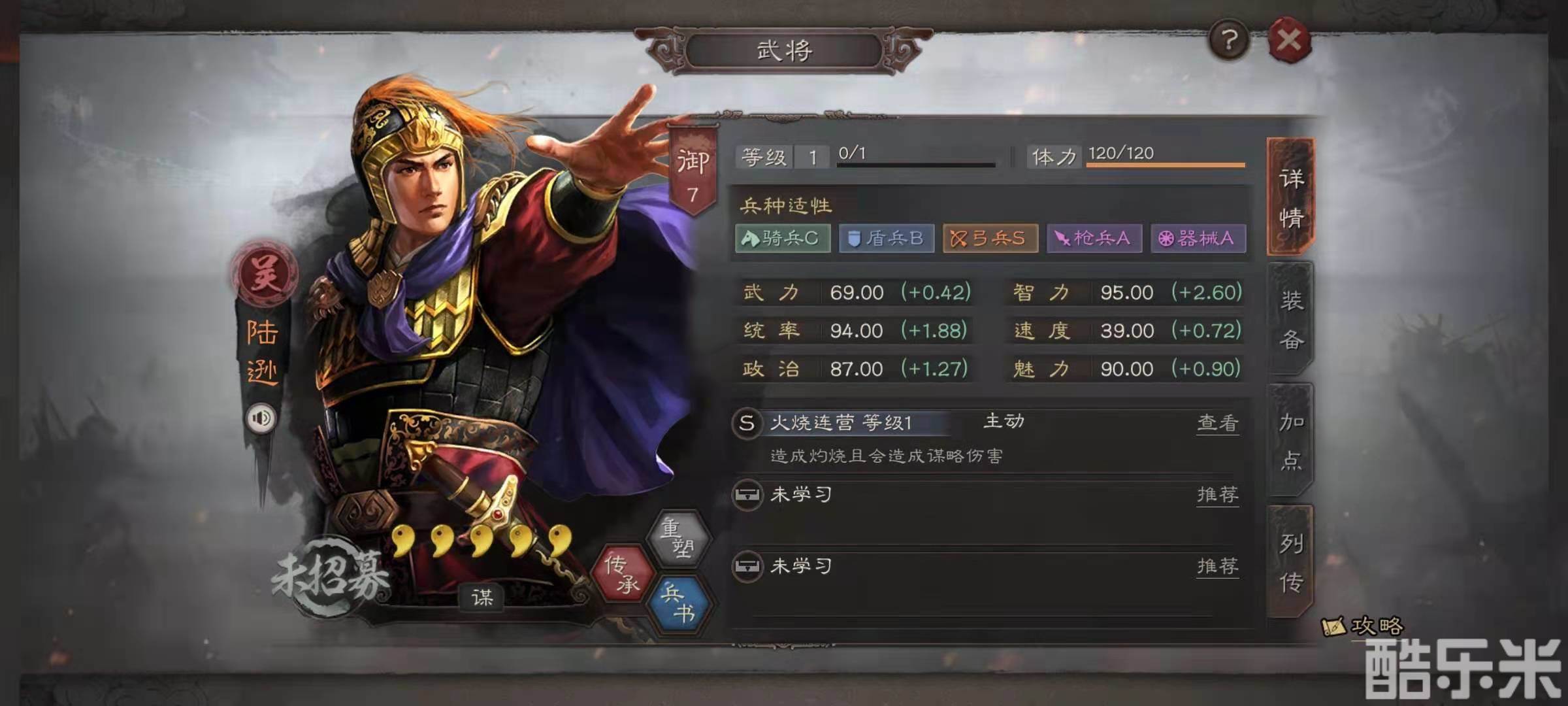 吕蒙的好处就是非常均衡,而且战法适用于各个武将,搭配起来非常容易,而且控制效果很赞,技穷和缴械都能限制对方的输出。陆逊的舒适智力为95点,初始统率值是94点, 也是非常高的,自带战法火烧连营,效果是对敌方单体施加灼烧状态,如果伤害目标已经被灼烧,则造成焚营效果,大面积造成伤害。周瑜的面板属性是神火技,效果是每次发动战法后,都有几率攻击敌方全体武将,如果周瑜是主将的话,则还有额外的几率施加灼烧效果。