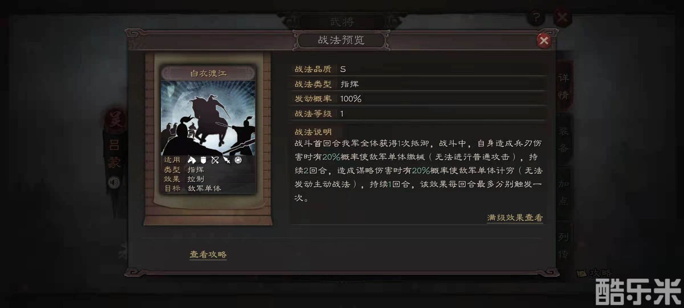 这五名武将中,小编选择的是吕蒙,陆逊和周瑜,吕蒙面板属性是武力初始81点,智力初始为89点,统率值初始为91点,吕蒙的属性非常平均,既没有特别突出的,也没有短板。吕蒙自带的战法白衣渡江,效果是可以根据伤害类型来造成不同的控制效果。在战斗的第一个回合,我方全体获得抵御状态,如果武将造成的是兵刃伤害,可以有几率使得敌方武将缴械,如果是谋略伤害,则可以触发技穷效果。