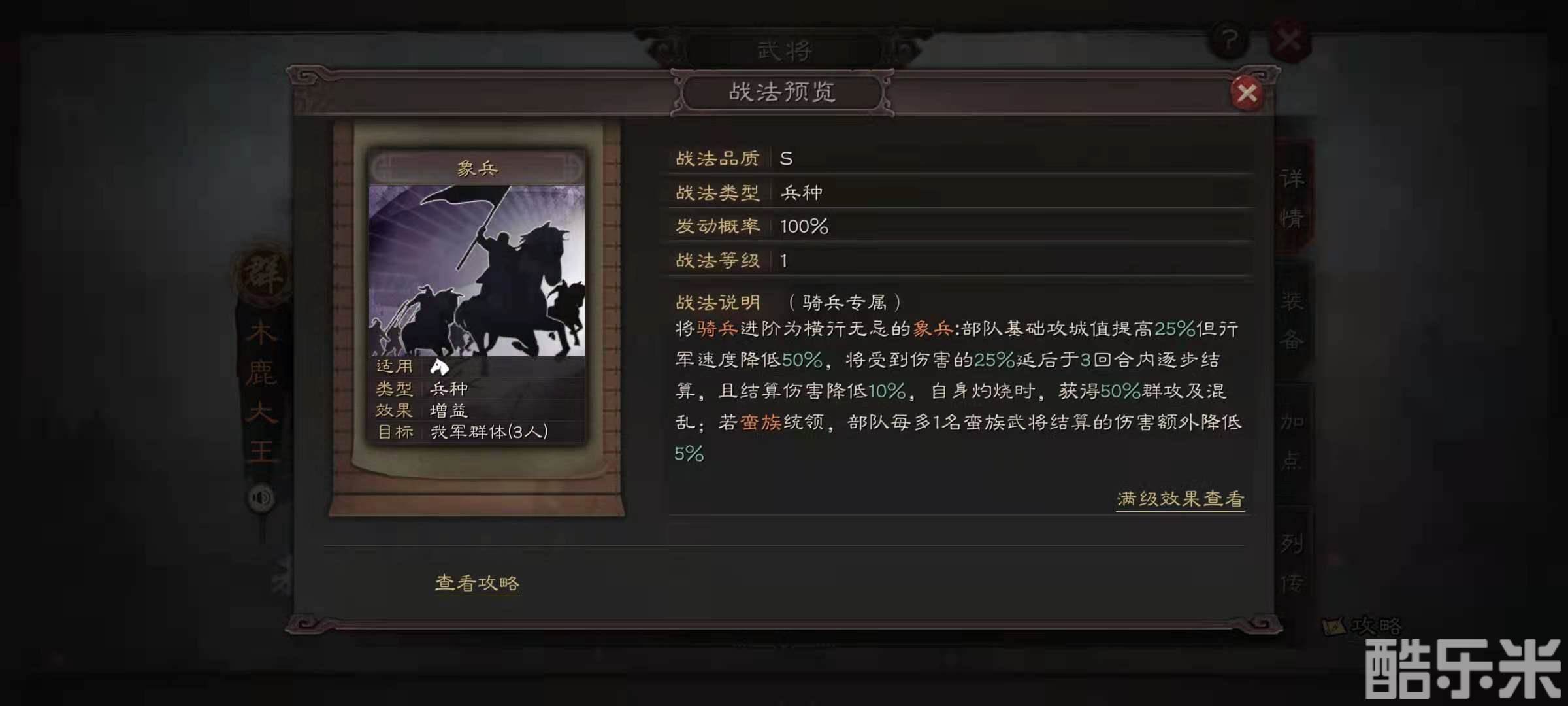 骑兵是三国志战略版中一定速度最快,造型也最霸气的兵种,喜欢大范围作战的玩家都喜欢玩骑兵,而且各个势力也都有自己的骑兵玩法,可见是三国志战略版中人气最高的兵种。骑兵的特殊兵种有象兵,虎豹骑和西凉铁骑三种,其中象兵的特殊效果是提升队伍的基础攻城值,但是降低部队的行军速度。在战斗中受到的部分伤害会延后结算,同时这一部分伤害还能再降低10%,但是被灼烧的时候,会受到额外的混乱效果。如果是南蛮武将的话,可以额外增加减伤。