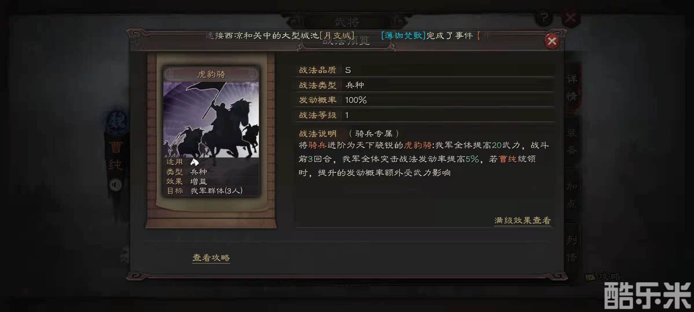 虎豹骑的特殊效果是提高己方全体武将的武力值20点,在开始战斗的三个回合内,全体武将的突击类战法发动几率提升,如果是曹纯统领的话,可以额外提升战法发动的几率。虎豹骑是突击星武将的春天,而且使得这些暴力流派变的更加犀利,和西凉铁骑不同的是,虎豹骑的效果提升除了有前三个回合的爆发外,后续武力加成不会消失,所以可以持续发挥作用。