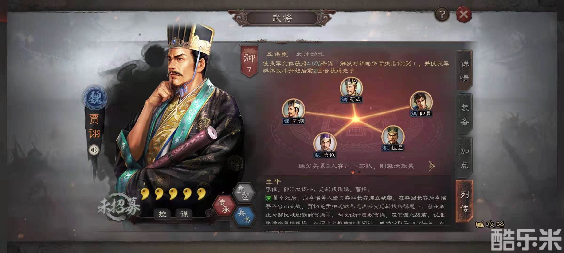 贾诩另外两个技能搭配是挟势弄权和伪书相间,其中挟势弄权可以造成混乱效果,也就给了程昱机会。伪书相间可以造成单体伤害,并且对处于混乱状态的目标有加成。程昱其他的战法搭配是四面楚歌和机略纵横,都是持续伤害的技能。