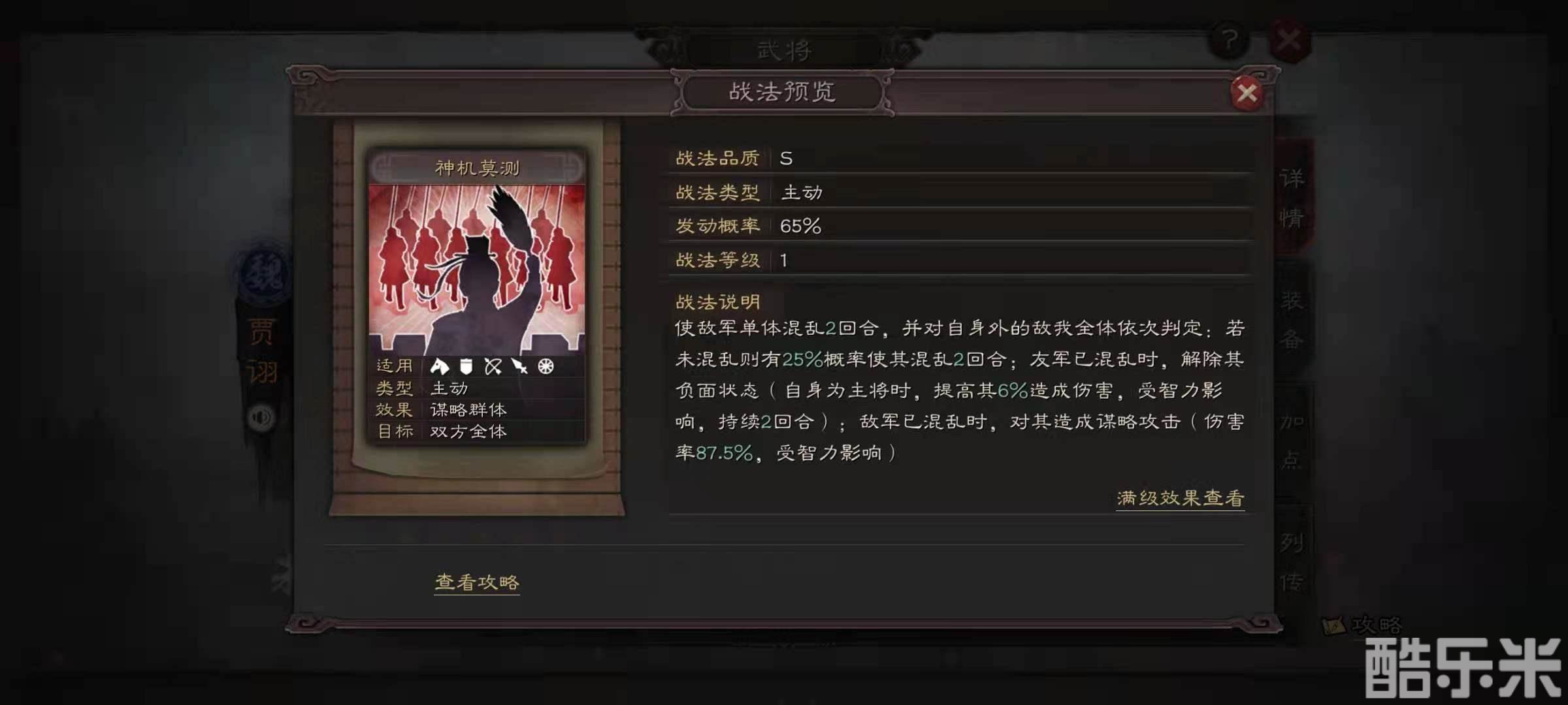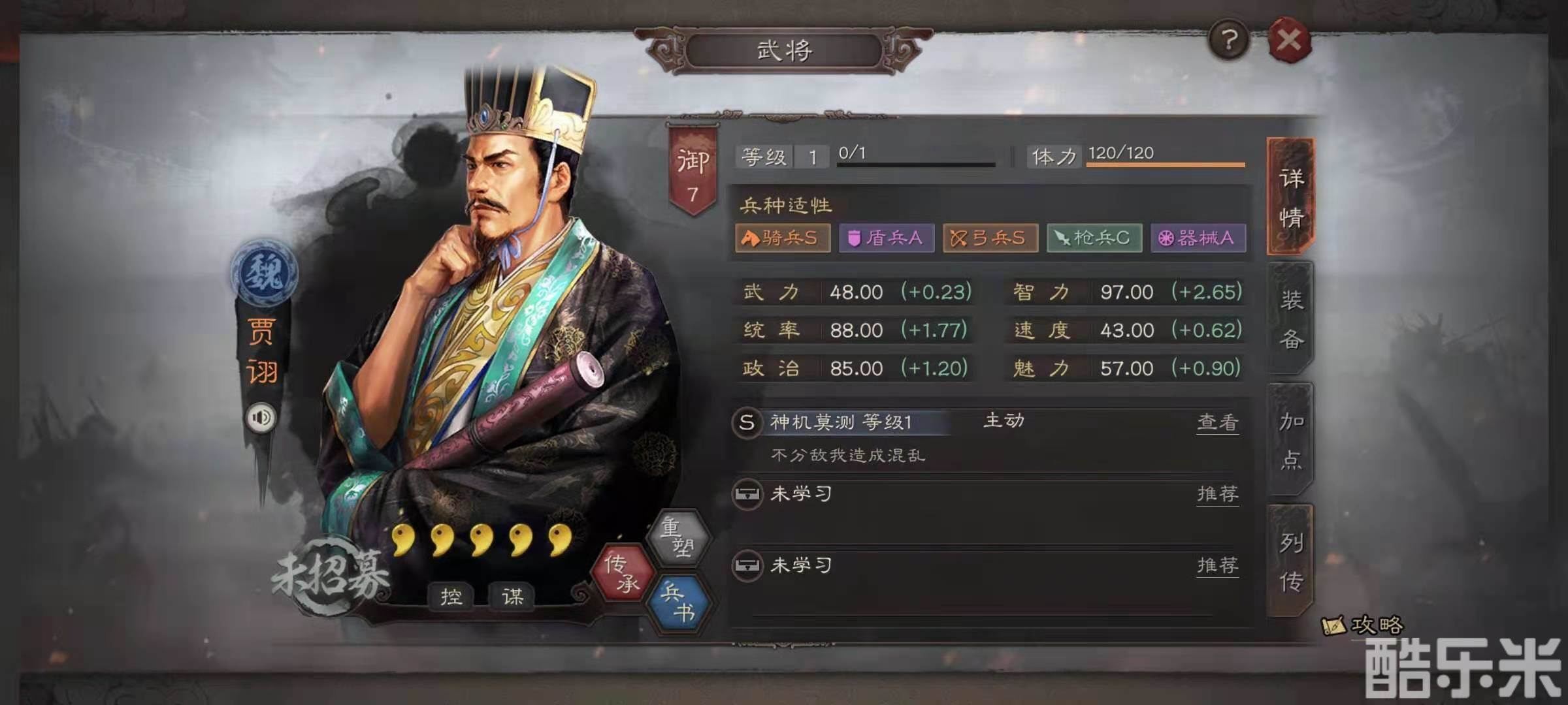 贾诩的优势是混乱效果,自带战法神机莫测的效果是使得敌方单体被混乱两个回合,并且对出贾诩之外的全部武将(包括己方)进行判定,如果没有混乱则有几率将其混乱,如果已经混乱,友军就直接解除混乱,敌军就造成一次伤害。贾诩的技能虽然对己方有一些影响,但是并不妨碍贾诩对敌方的强悍的控制力。贾诩的智力初始值达到了97点,配合上混乱造成的额外输出,贾诩的总输出量非常可观。