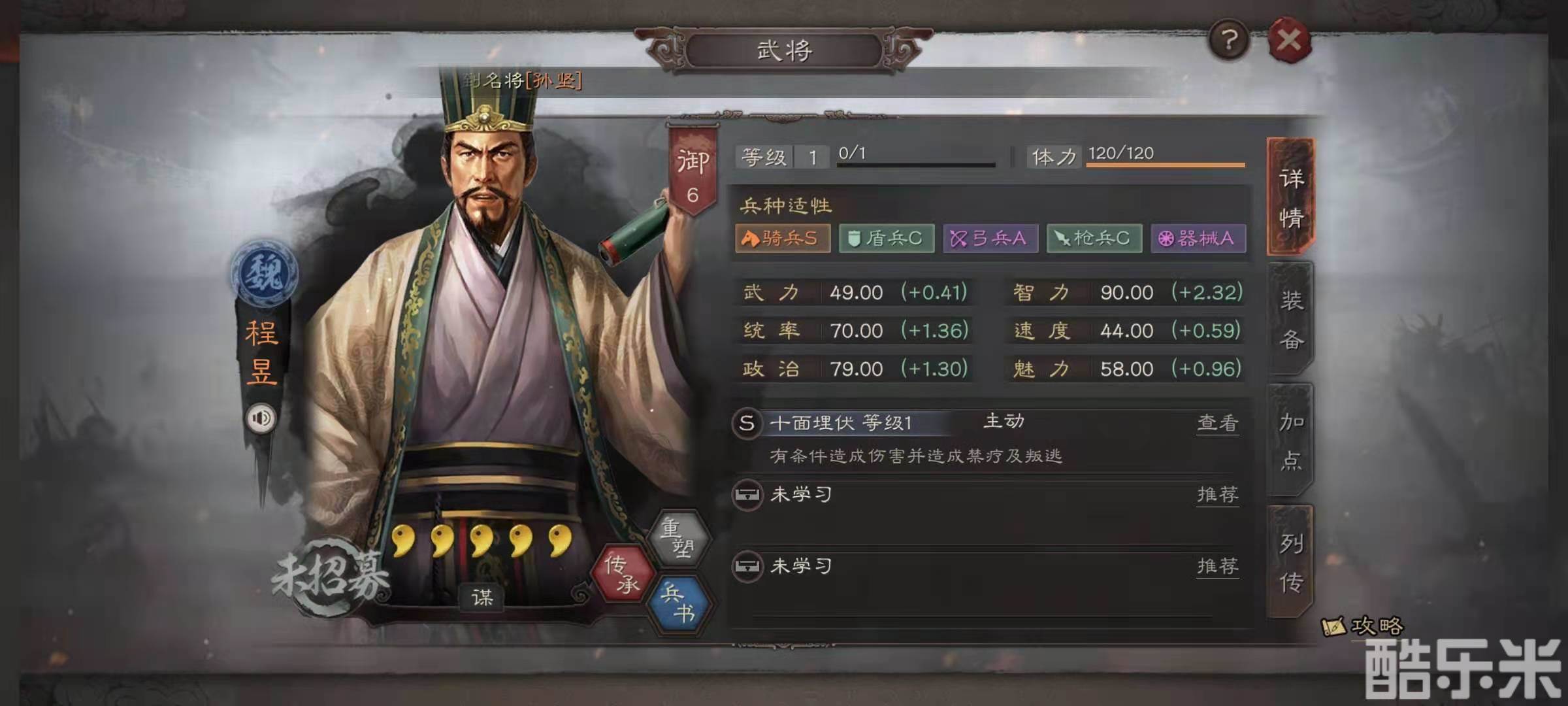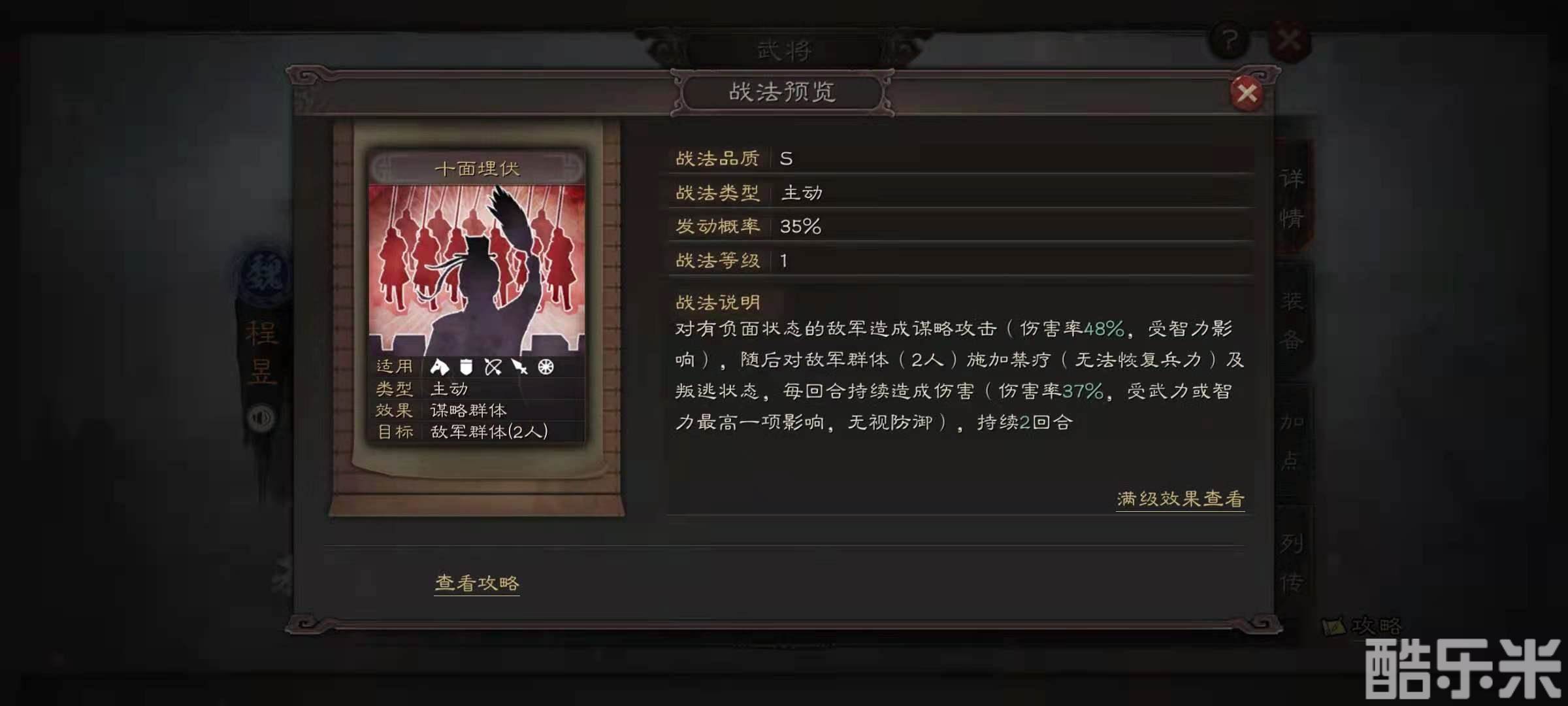 程昱的智力初始值为90点,自带的战法十面埋伏效果是对有负面状态的敌方武将造成谋略伤害,随后为两名敌军附加禁疗和叛逃效果,被禁疗的目标无法恢复兵力,叛逃是持续损失一定的兵力,且伤害无视防御。程昱本身的战法需要有引子才可以更好地发挥,这一点贾诩正好给了程昱方便。