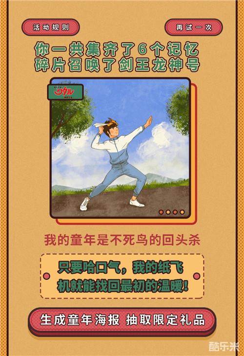 当6个记忆碎片被集齐后,剑王龙神号就会被完全唤醒,体验者将会获得一张属于自己的童年海报,还能拥有一句和“必胜,登龙剑”一样酷炫的个人口号;此外,分享这份珍贵的童年记忆给好友,还能获得抽奖机会。看到这里,很多读者朋友是不是也想尝试呢?