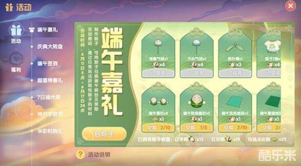 活动界面中第一页是看不到龙舟的兑换的,需要往后翻一点,另外在本次活动中还能够兑换到粽宝护栏、粽叶地砖、粽子气球等道具。