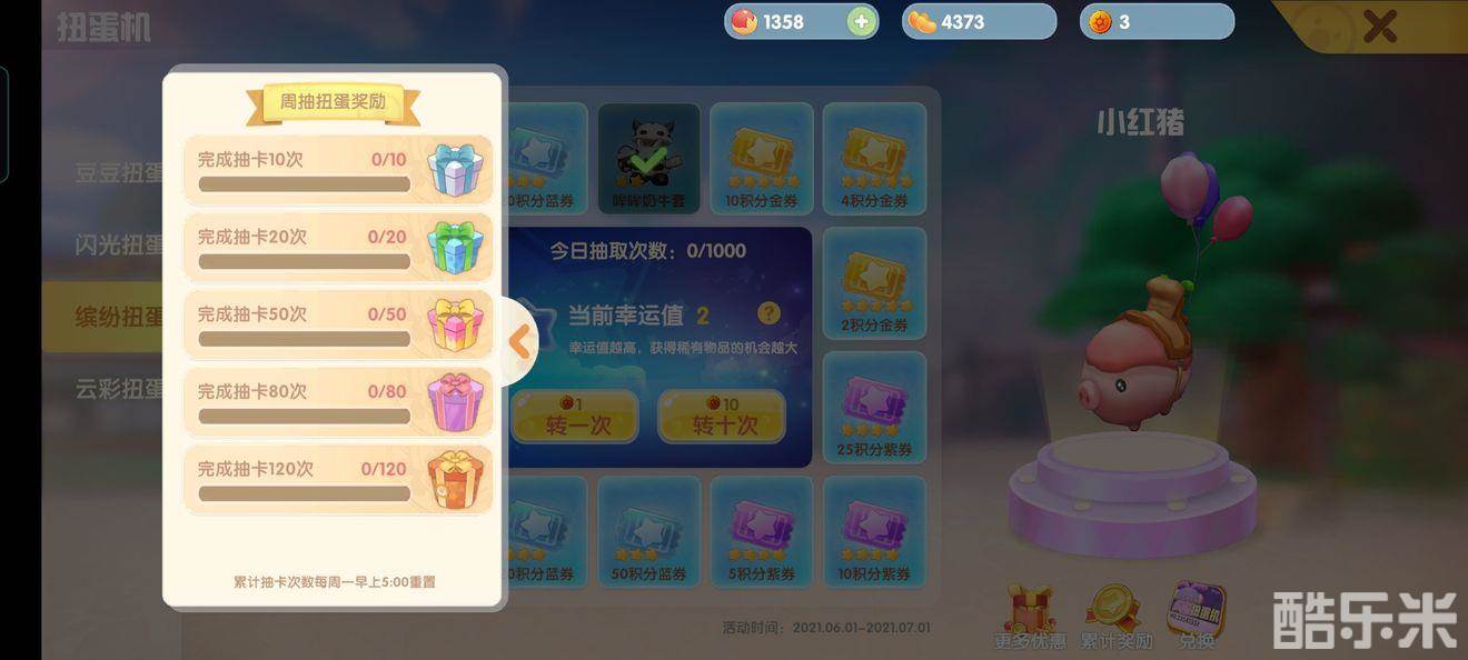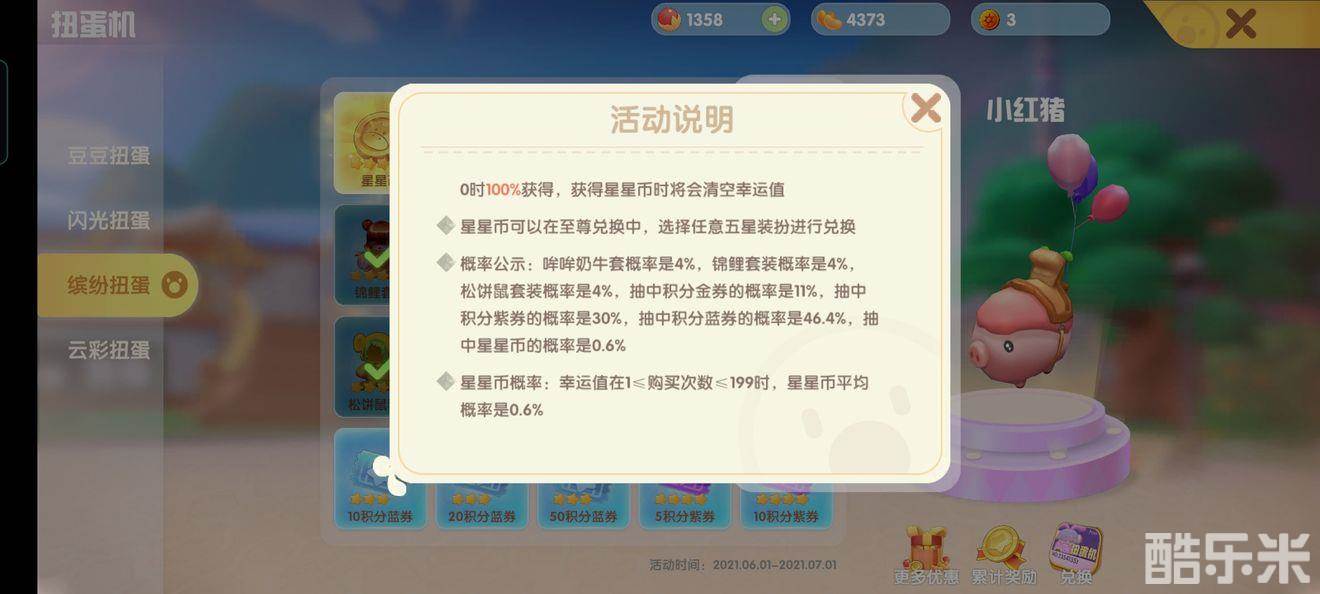 缤纷扭蛋每次抽取需要消耗金豆,一次为60,十连为600,根据道具的稀有度划分了多个等级,保底机制为200抽,即玩家们最非的情况下需要12000金豆才能达成保底。