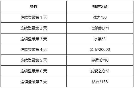 1、活动期间内,每日登录游戏,即可在邮箱中领取:体力*150、七彩盾菇*5、十字架*4、金币*30000哦~