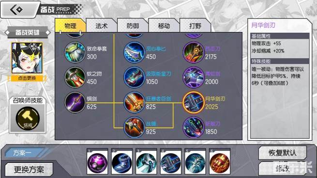 接下来确定以打野为核心的出装方向,比较常见的成型的六件套是:真·狩猎核心R+攻速鞋+月华剑刃+合金铁刃+血怒之拳+寒霜之力。这套装备,一方面能够提供极高的攻速,加上冷却缩减,能让你一秒十几刀,打野速度够快,伤害也足够爆炸;另一方面也可以提高你的血量上限,让你不至于被对面几下秒了,情况不对的时候,能有足够的血量逃跑。