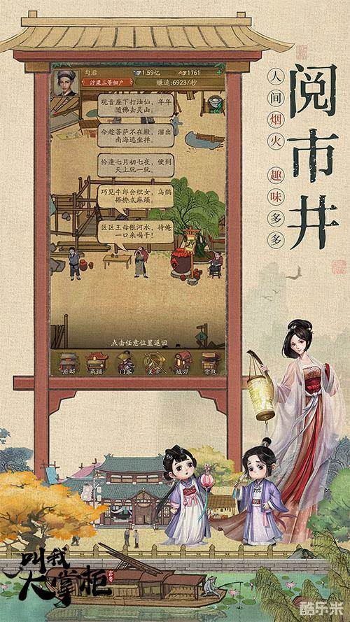 街市行人,摩肩接踵,川流不息。城中屋宇鳞次栉比,茶坊、肉铺、庙宇、公廨。市招旗帜悬挂“彩楼欢门”招揽生意。店中绫罗绸缎、珠宝香料、香火纸马等专门经营。此外尚有医药门诊,大车修理、看相算命,各行各业,应有尽有。《叫我大掌柜》在融入丰富的古代市井生活图景上,细心创作了众多特点鲜明的背景故事。游戏中玩家亲临话本中的故事、人物小传,并与众多经典人物形成社会关系,在碎片化故事剧情线里,通过古代商业经营为切入点,与整个游戏世界巧妙串联。多种多样的玩法模式,在享受游戏带来的休闲和乐趣之余,更能从中了解到中华传统文化的深厚风韵。