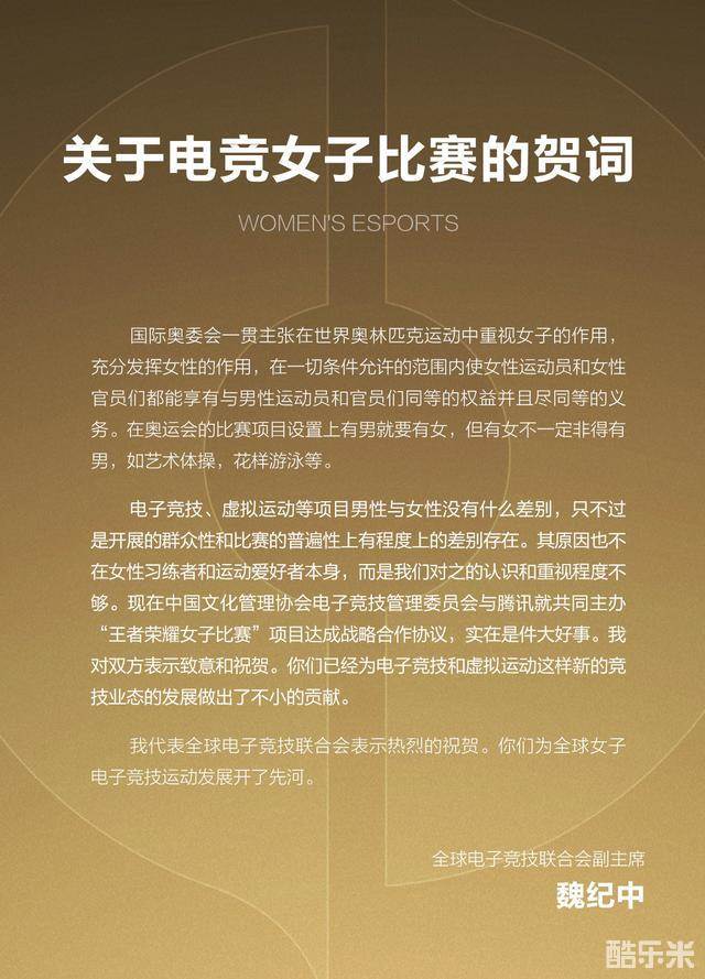 目前,《王者荣耀》的女子电竞赛事具体细节还在筹备中,全球电子竞技联合会副主席魏纪中向《王者荣耀》发表了贺词。