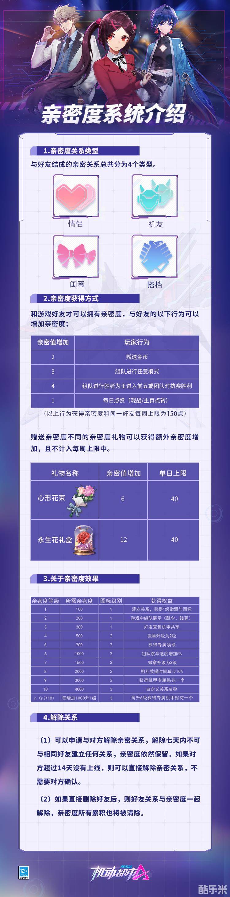 玩家们可以与自己的游戏好友缔结情侣、机友、闺蜜、搭档四种亲密关系。与好友组队战斗、互送礼物、赠送金币等行为,可以逐渐提升彼此的亲密度。当亲密度达到相应的等级时,就要可以解锁关系徽章还有多重奖励。