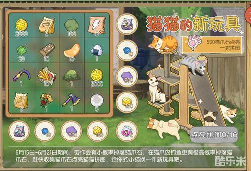 活动期间,村民通过砍树、采集、采矿、钓鱼和收割等日常操作,就有机会获得猫爪石道具~ 收集到一定数量的猫爪石即可在活动界面上点亮猫猫拼图,获得奖励。当点亮的拼图区域连成直线时,即可获得相应位置的连线奖励,包括金贝壳、晴奈特制饮品、紫毛球等;当整个拼图都点亮时,还可获得最终大奖——猫爬架!快收集猫爪石参加活动,给你的小猫咪换一件新玩具吧!
