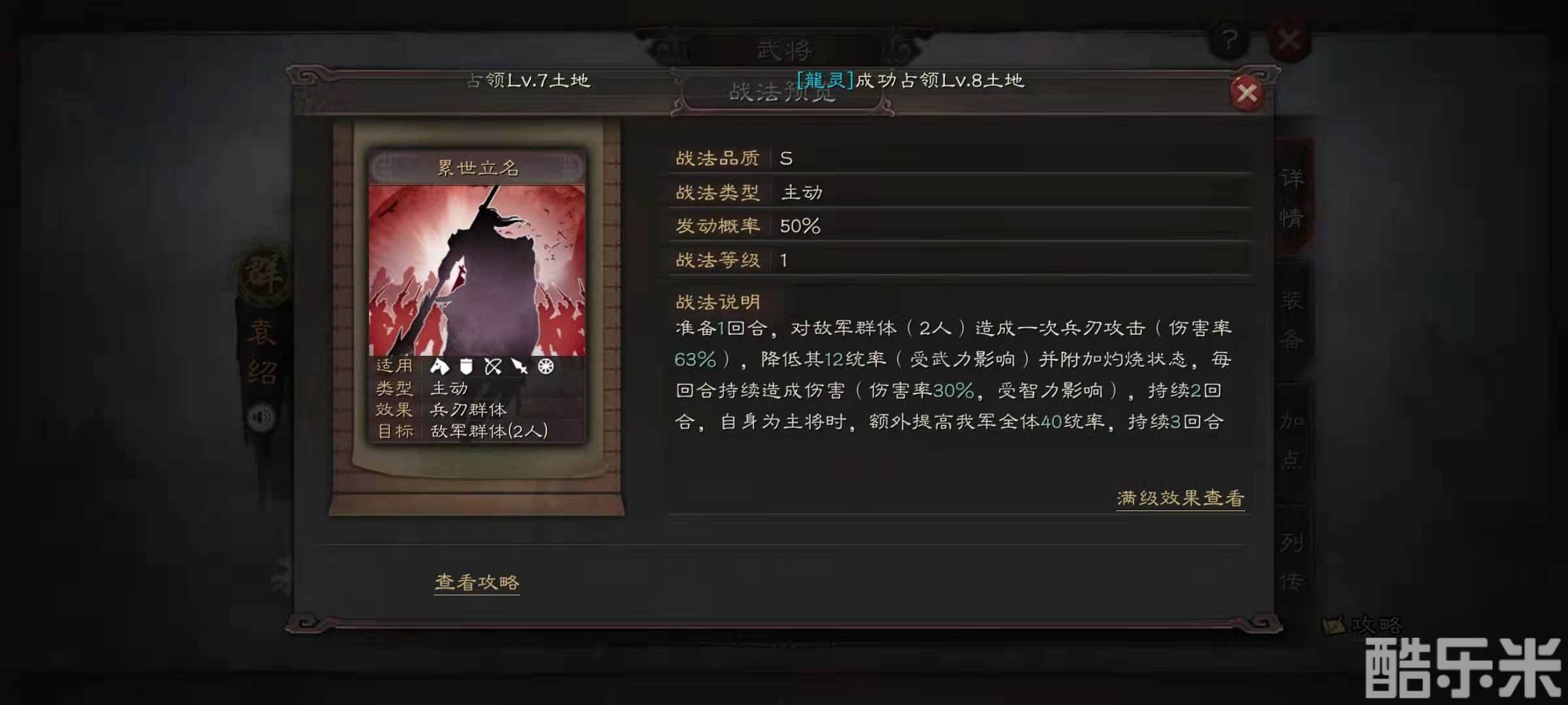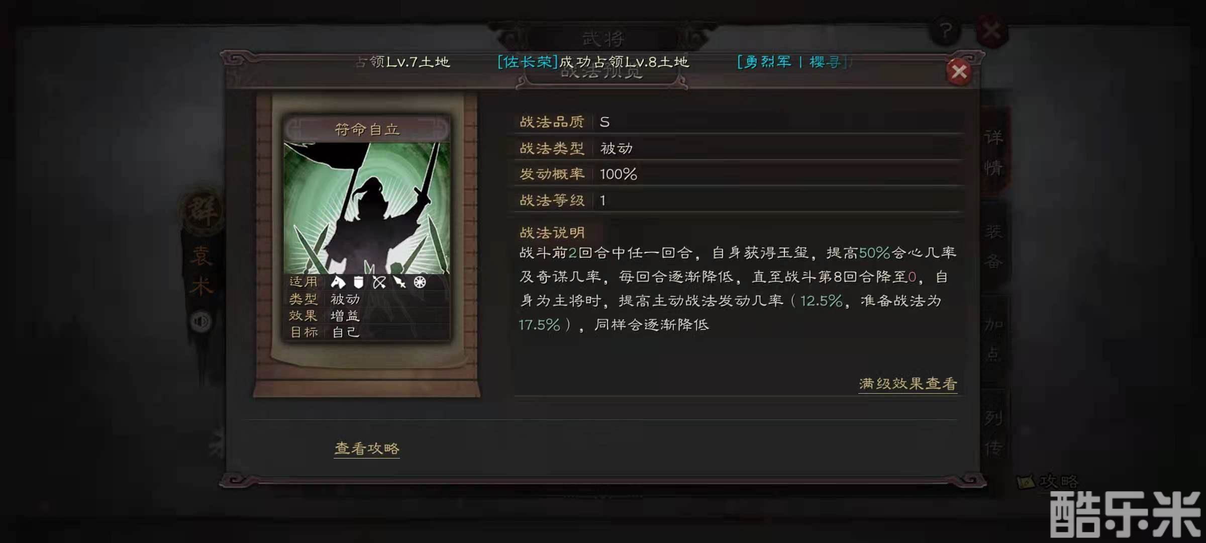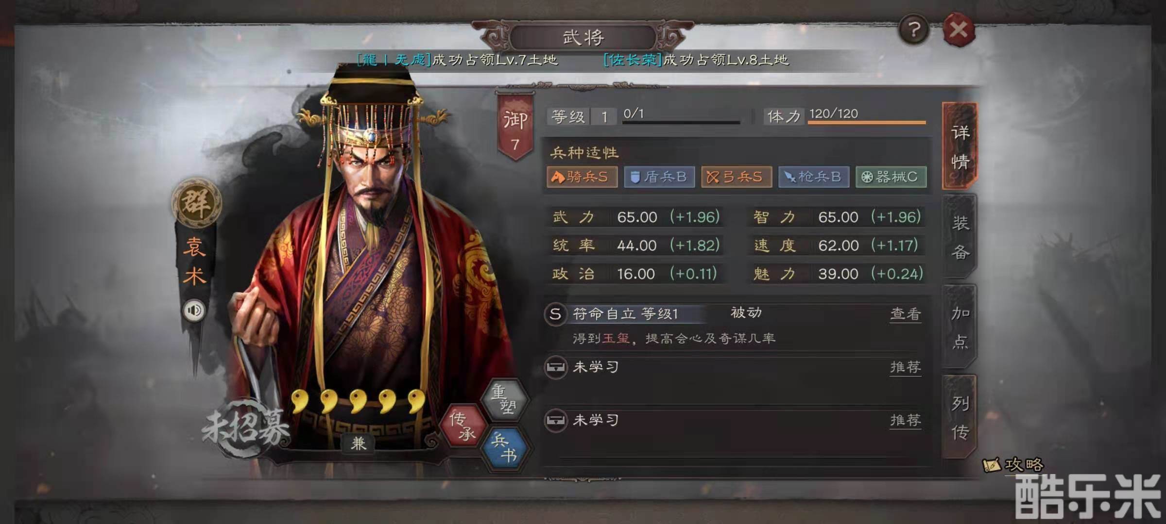 先来看一下袁绍和袁术的自身属性,袁术的面板属性比较低,兵种属性还不错,骑兵和弓兵都是S。自带的战法是符命自立,效果是在战斗开始之后的两回合内,袁术可以选择一个回合获得玉玺,玉玺能提升50%的会心几率和奇谋几率,之后的回合内不会立即消失,但是会逐渐衰减,一直持续到第八回合。如果袁术是主将的话,则可以额外提升主动战法的发动几率比,同样也是逐渐降低。