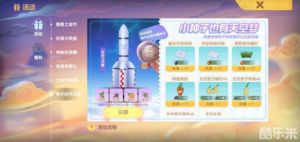 太空活动一共会持续14天,所以均匀考虑下,大家每天每种变异作物至少要收获三个才能完成兑换,因此大家在活动期间的作物种植绝对不能忽略。